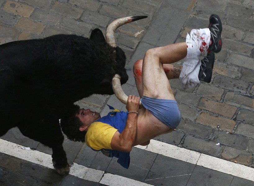 رجل يطعن بقرن ثور في فخذه بشارع في مدينة بانبلونا بأسبانيا في اليوم السادس من مهرجان الثيران