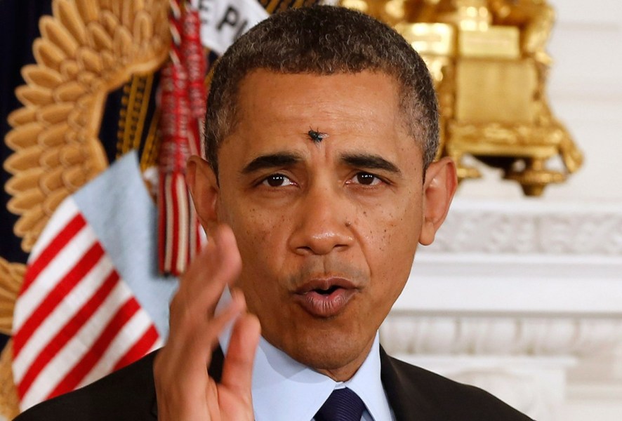 ذبابة تحط على جبين أوباما رئيس الولايات المتحدة عندما كان يلقي خطبة في مأدبة بالبيت الأبيض في 24 يناير 2013