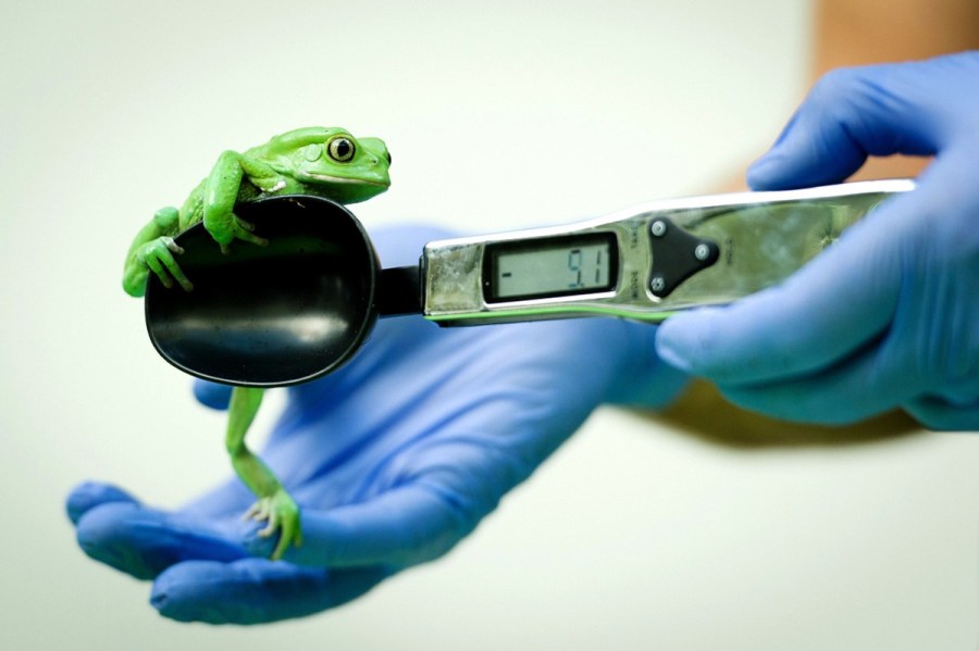 موظف في حديقة حيوانات بلندن يقيس وزن ضفدع في 21 أغسطس 2013