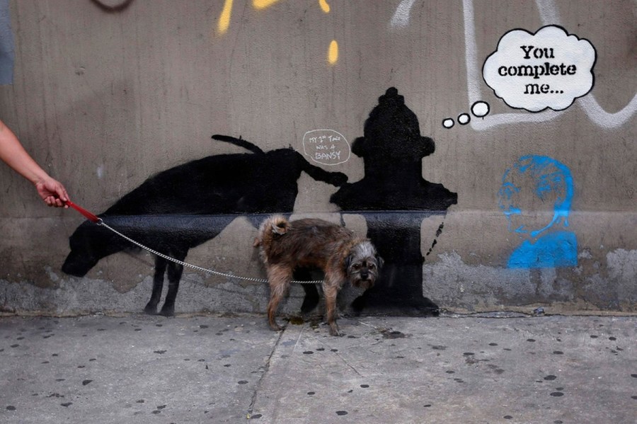 كلب يتبول على جانب رسم جرافيتي لفنان بريطاني يبدع أعماله على الجدران في نيويورك
