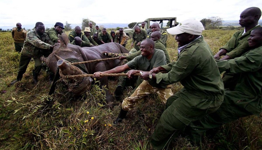 موظفون بقسم إدارة الحياة البرية في كينيا يضعون كركدن مخدراً في قفص بحديقة بحيرة ناكورو الوطنية تقع على بعد 160 كيلومتراً غرب نيروبي توطئة لنقله إلى حديقة لوما الوطنية