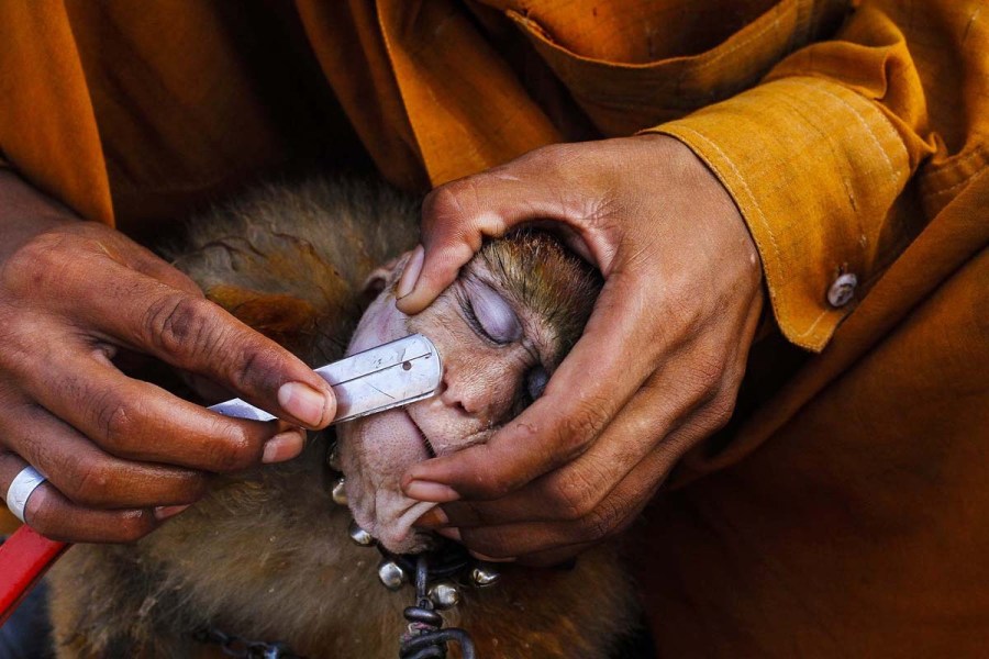رجل يحلق شعراً على وجه قرد قبل أداءه عرضاً في باكستان