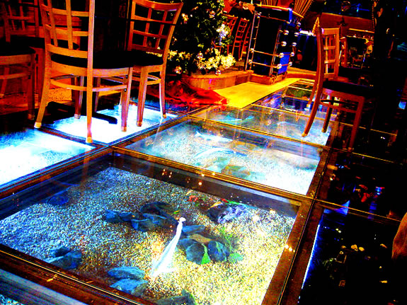 Dance floor Aquarium سيجعلك هذا النوع من الأحواض تسير على أسماك القرش وتنظر إليهم من أعلى، فهو مصمم لكي يكون أرضياً، من خلال زجاج غير قابل للكسر من كثرة السير عليه.