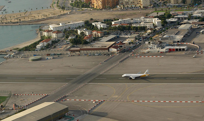 مطار جبل طارق، يتمميز بمدرجه الذي يتقاطع مع شارع عام . تم بناء المطار في وسط المدينة نظراً لضيق المساحة في المنطقة. و تتوقف حركة سير السيارات، لحظة عبور الطائرات ثم تواصل مجدداً.