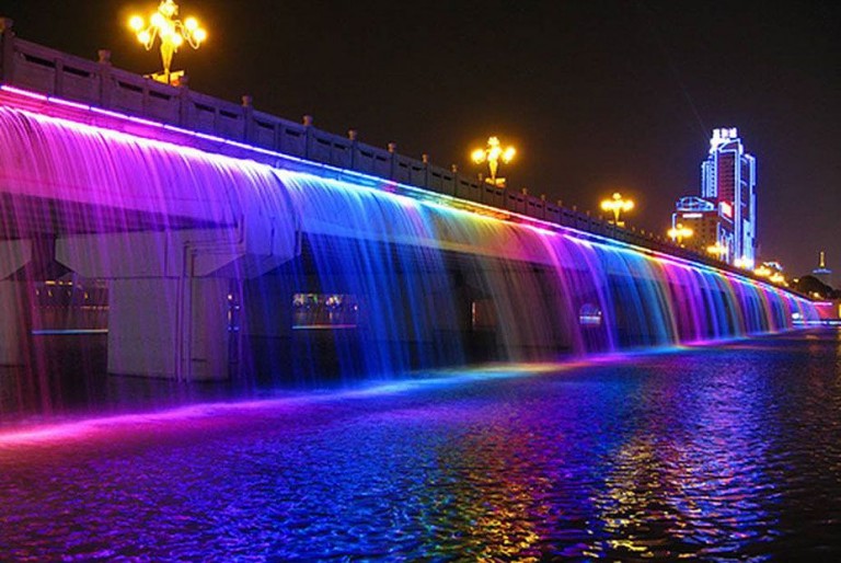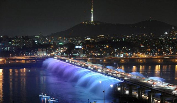 – نافورة قوس قزح في وسط مدينة سئول على جانبي جسر بانبو فوق نهر هان بكوريا الجنوبية. و تعتبر اطول نافورة جسر في العالم مكونة من ما يقرب من 10 آلاف فوهة مضاءة بالـ LED تعمل على طول كلا الجانبين بطول 1140 مترا تطلق 190 طن من الماء في الدقيقة الواحدة.