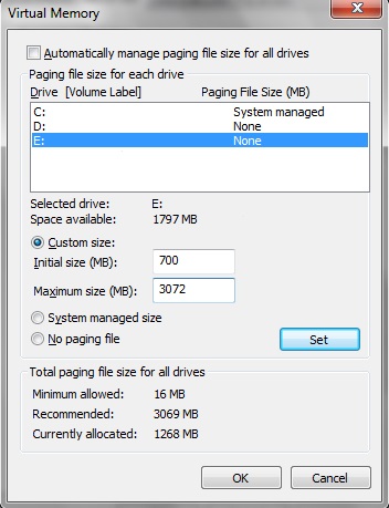 2. ثم تقوم بالضغط علي نافذة Advanced مرة اخري ثم تقوم باختيار Change أسفل Virtual Memory section،ثم تقوم باختيار الفلاش ميموري ثم تقوم بالضغط علي Custom Size، ثم تقوم باختيار المساحة لاستخدامها في الرام كما بالصورة بالاسفل: