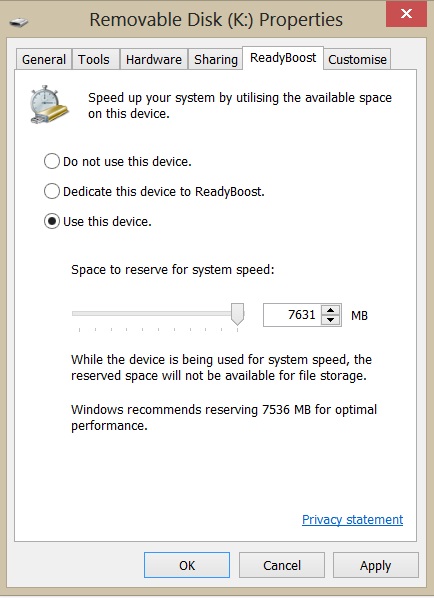 2. تقوم بالضغط كليك يمين علي الفلاش ميموري ثم تقوم باختيار Properties، ثم تقوم بالضغط علي ReadyBoost، ثم تقوم باختيار Dedicate This device to Readyboost وفي حالة اختيار هذا الخيار سيتم تحويل الفلاش ميموري بالكامل إلي رام، أما إذا أردت تحديد المساحة فتقوم باختيار آخر خيار وهو Use This device كما بالصورة التالية: