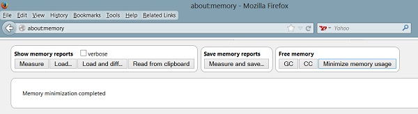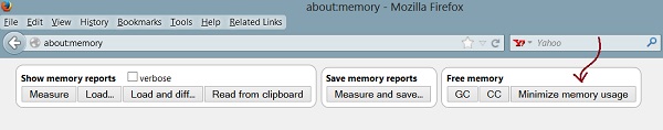 الطريقة بسهولة أنك تقوم بنسخ ولصق جملة about:memory في شريط العنوان بالمتصفح، ثم بعد ذلك ستلاحظ أيقونة بعنوان Minimize Memory Usage فتقوم بالضغط عليها.