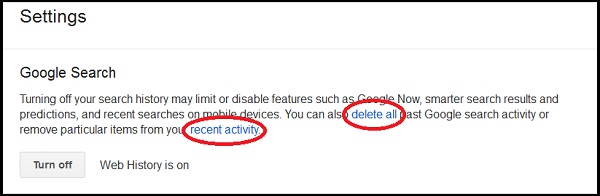 3. ثم تقوم بالضغط علي أيقونة Turn off لمنع جوجل من تسجيل عمليات البحث التي تقوم بها. ويمكنك اعادة تفعيلها مرة اخري بسهولة إن أردت ذلك.