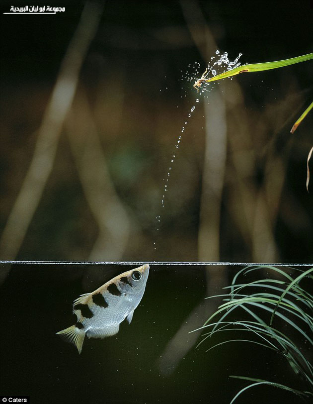 4- من ثم تضغط لسانها بعكس اتجاه الماء لتضيق القناة ومن ثم تقلص أغطية خياشيمها بقوة لتنطلق قذيفة وطلقة الماء جهة الفريسة بقوة اندفاع كبيرة جدا .من الممكن أن تصل الطلقة لارتفاع 5 متر.
