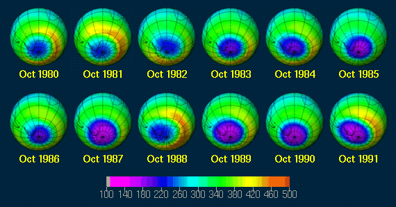 أوضحت القيـاسات التي تمت بواسطة الأقمار الصناعية، أن كمية الأوزون في الغلاف الجوي قد نقصت بنسبة 5% عام 1978 عما كانت عليه عام 1971، وبلغت نسبة النقص 2.5 % في الفترة الواقعة ما بين 1979 – 1985، في المنطقة الواقعة بين خطي عرض 53 شمالا وجنوبا، ونتيجة لاستهلاك الأوزون، اكتشف ثقب الأوزون فوق القطب الجنوبي عام 1985، حيث وصل النقص إلى 50 %.