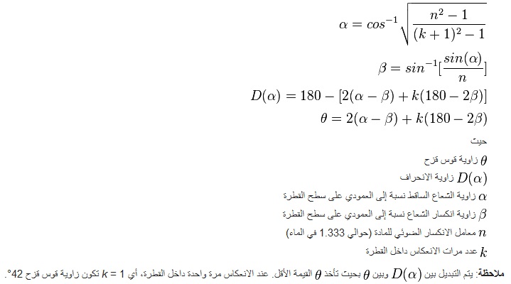 يمكن استنتاج العلاقة الرياضية لزاوية قوس قزح (نصف زاوية الرؤية) بدلالة معامل الانكسار من العلاقات الاتية: