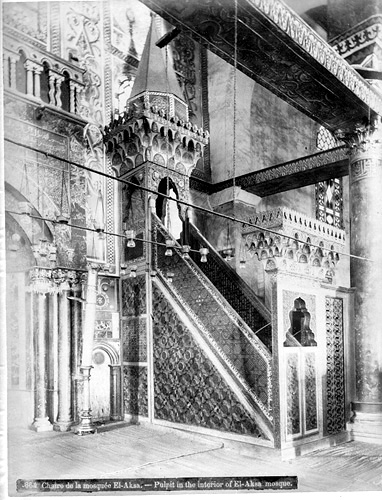 وفي عام 1389هـ / 1969م, أحرق المصلى القبلي في حريق الأقصى مما أدى أيضا إلى تدمير المنبر بالكامل، ولدى إعادة ترميم الجامع بين عامي 1389هـ/1969م و 1402هـ/1982م وقد استحدث منبر حديدي بسيط الصناعة مكان منبر نور الدين، وهو منبر مؤقت بقي هناك حتى تم إنشاء منبر آخر مطابق للمنبر الأصلي وبنفس المميزات والمواد في الأردن، وتم تركيبه في بداية شهر فبراير عام 2007م.