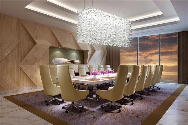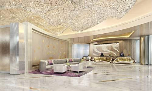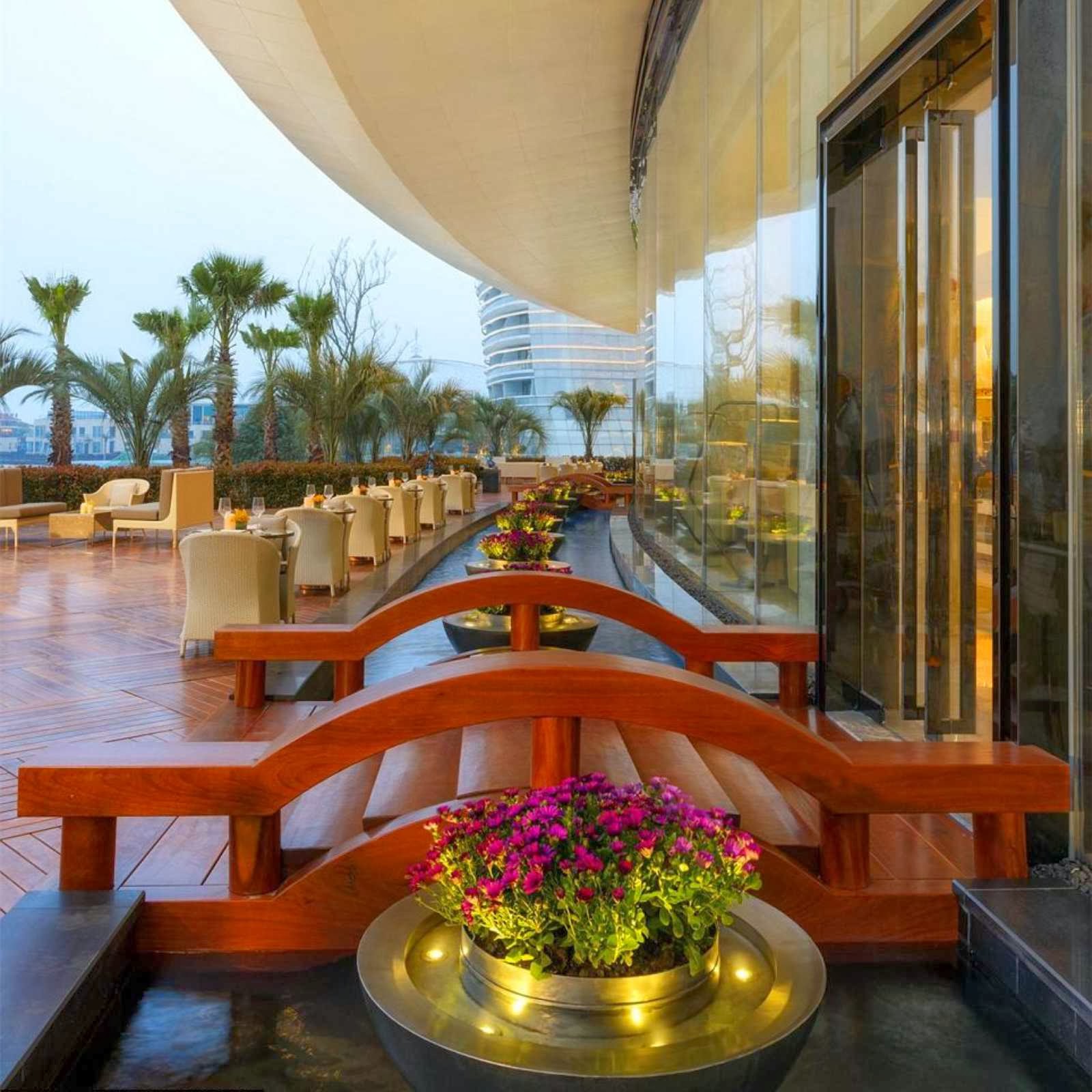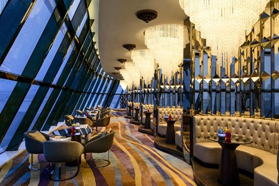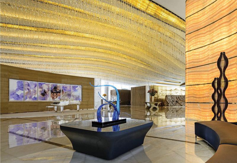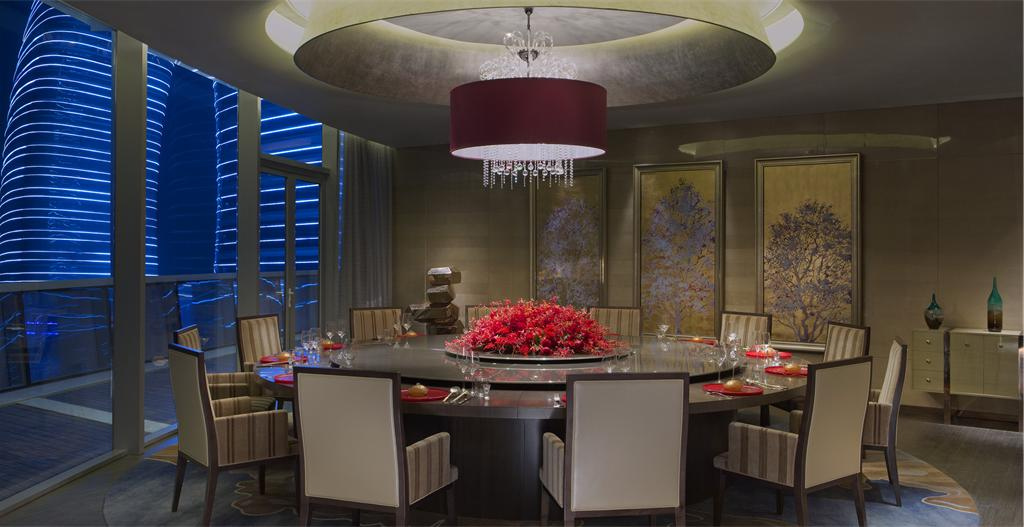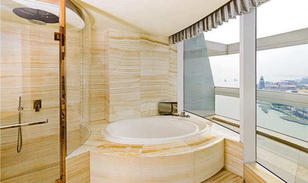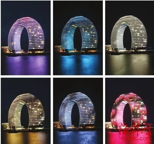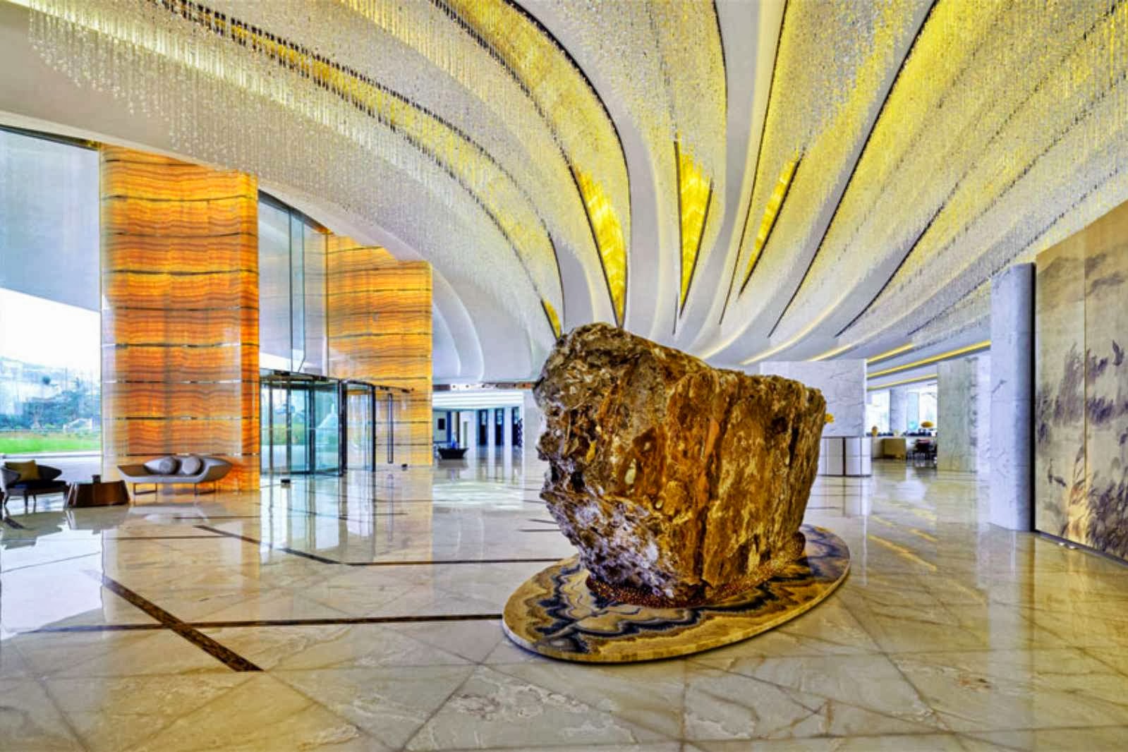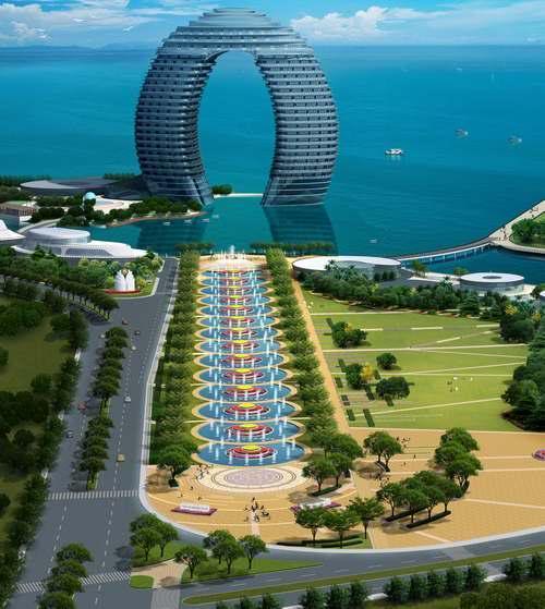 يبلغ طول الفندق 100 متر، فيما يصل عرضه إلى 116 متراً، ويحتل مساحة تصل إلى 300 متر مربع، وبمساحة كلية للمشروع تبلغ 95 ألف متر مربع، والمميز أن شكل طوابق الفندق يشبه نصف حلقة تنعكس أضوائها بأشكال مختلفة على سطح مياه بحيرة “تايهو” بمدينة “هوزو” الصينية.